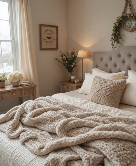 Chunky knit throws or pillows bring a soft, homey, and textured look to your space. They work well in cold seasons and add a warm, inviting vibe year-round Cozy Bedroom Ideas.