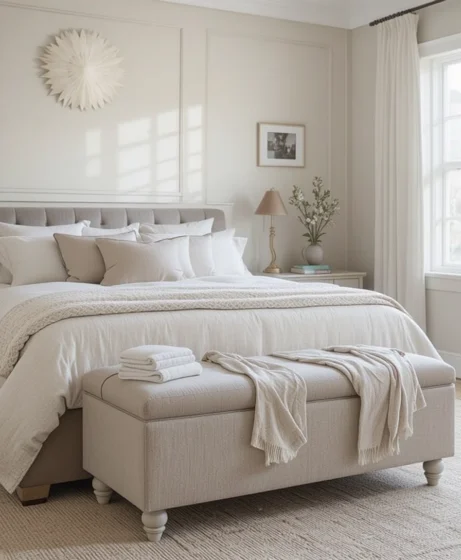 A fabric-covered bench adds storage, seating, and visual softness. It creates a cozy, layered look while keeping blankets or extra pillows within reach.
