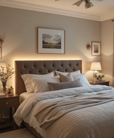 Install LED strip lights or soft lamps behind your headboard for a warm backlit effect. It creates a dreamy glow and makes your bed the cozy centerpiece of the room.