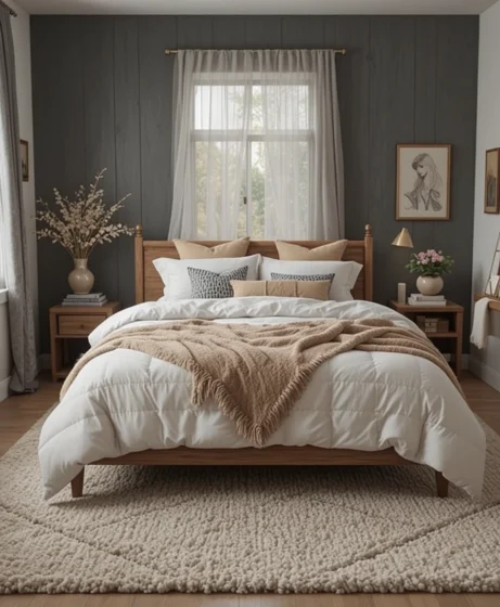 A soft shag or woven rug under your bed gives your feet a cozy first touch every morning. Rugs also help reduce noise, making your bedroom feel more peaceful and snug.