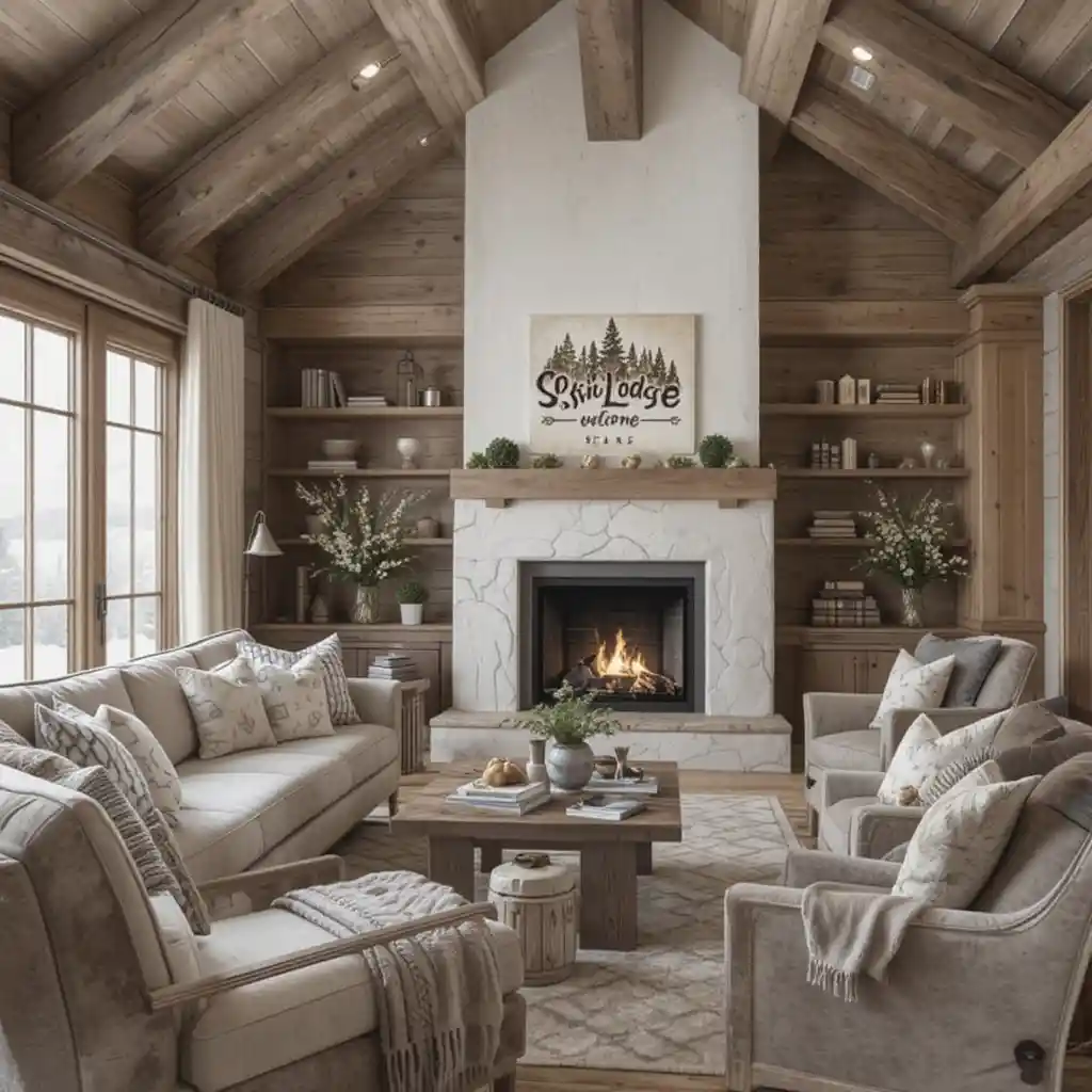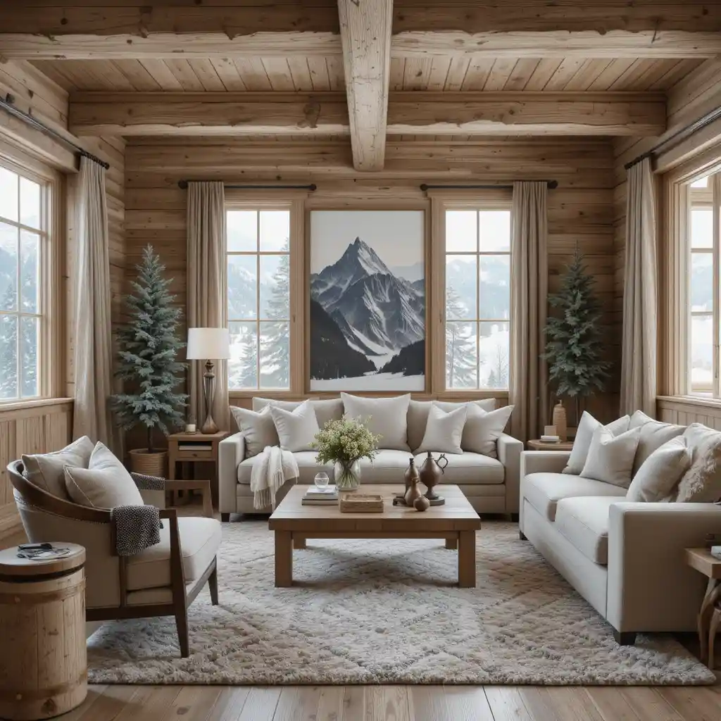 Stick to a neutral color palette—like whites, beiges, and browns—but accent with colors like forest green or cranberry red to reflect alpine forests and cozy winter cabins. Alpine Décor Design