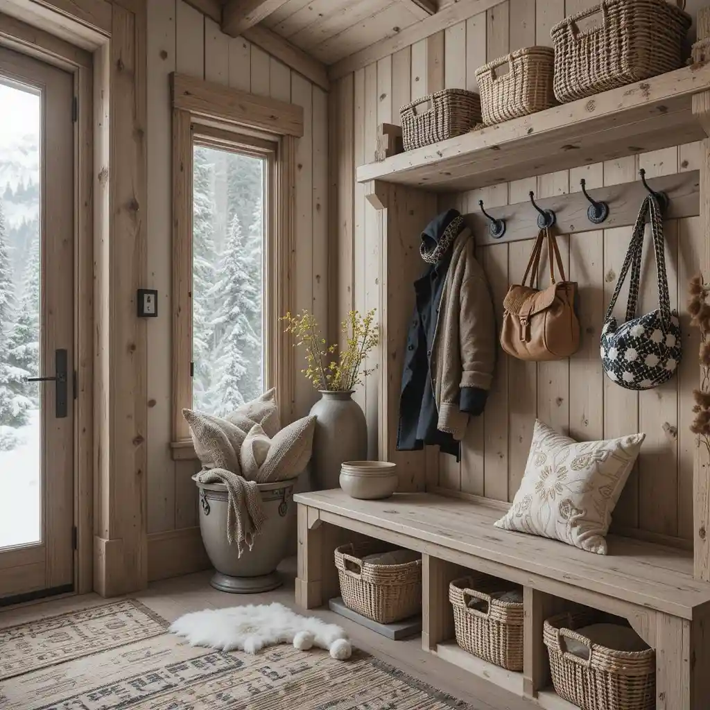Design your entry with wood benches, cubbies for boots, coat hooks, and woven baskets to organize gear and set the tone for a rustic retreat. Alpine Décor Design