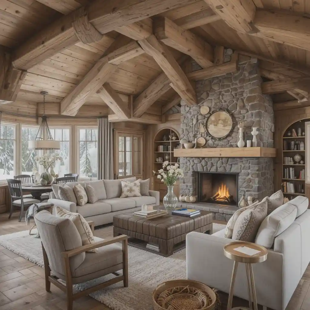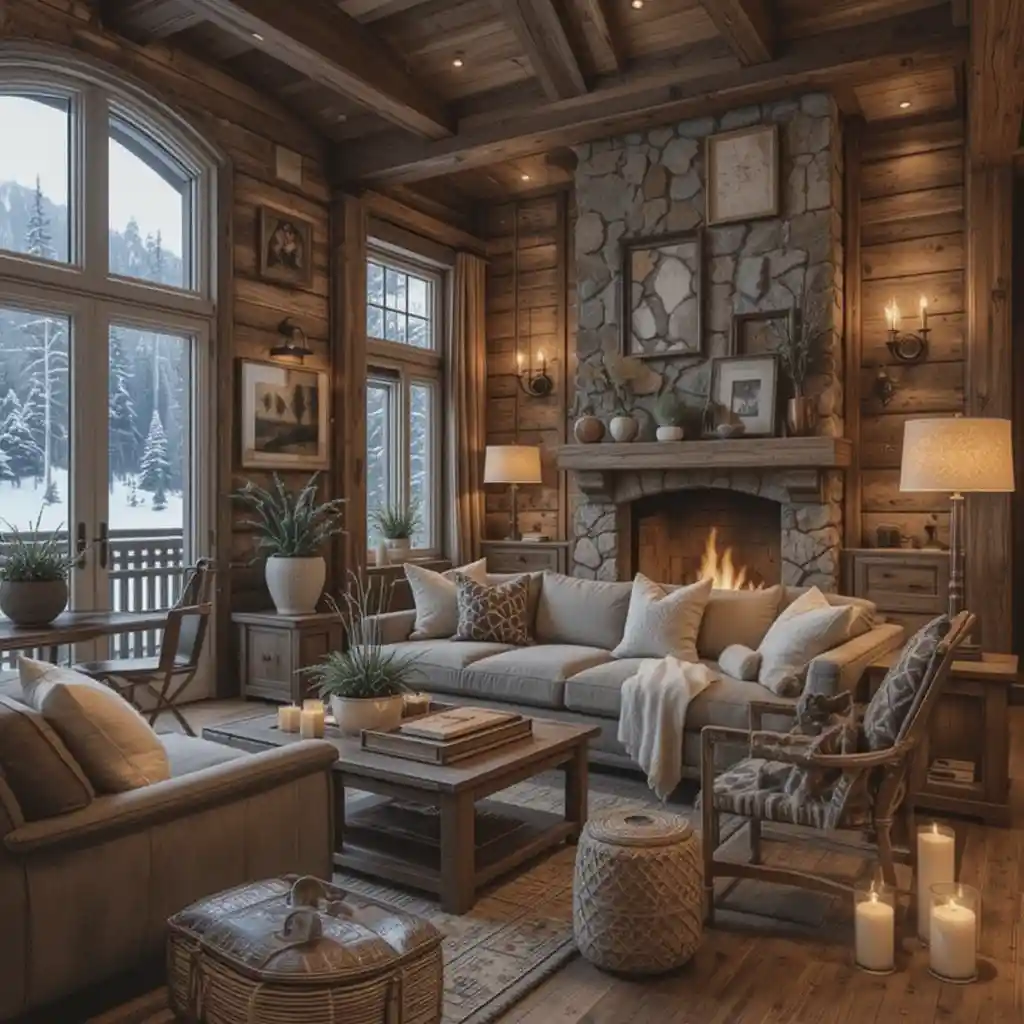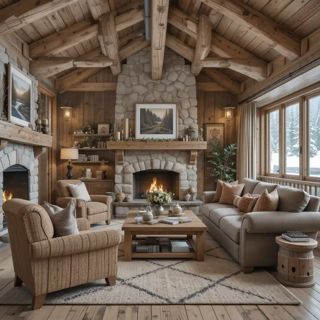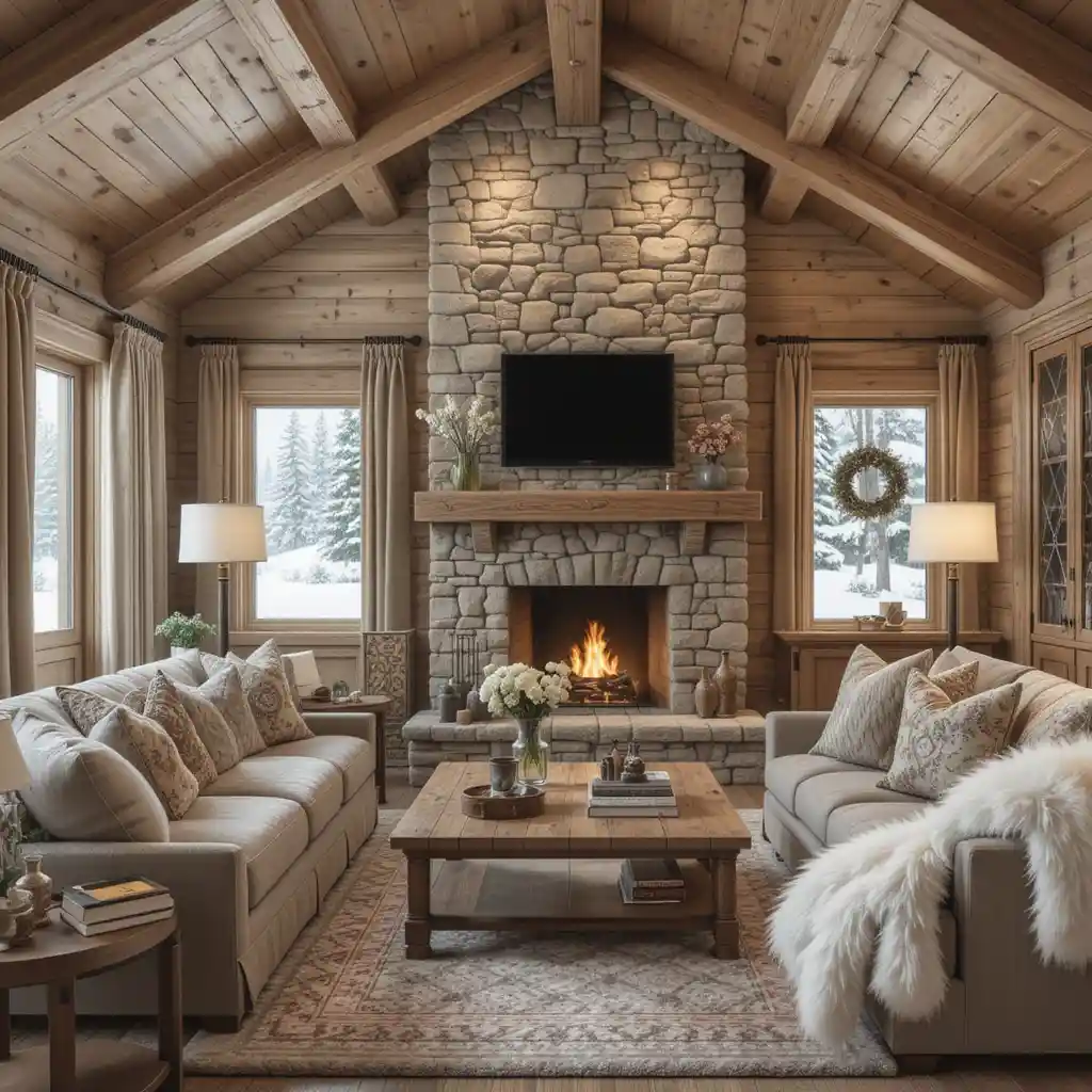 A fireplace made from natural stone or stacked stone veneer becomes the heart of the room, offering both warmth and Alpine-style authenticity.
