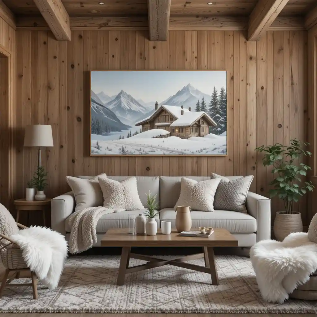 Add cozy layers with faux fur blankets and cushions in neutral or snowy tones. They give your living space or bedroom a soft, ski-lodge-inspired touch.