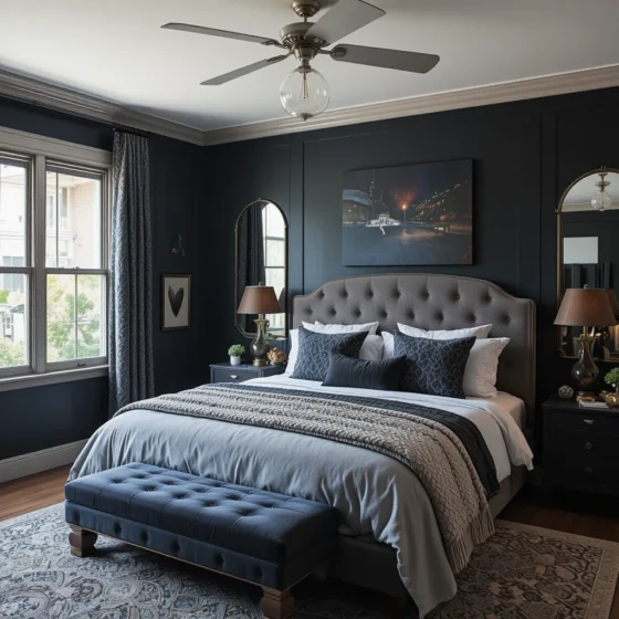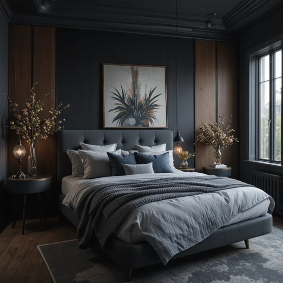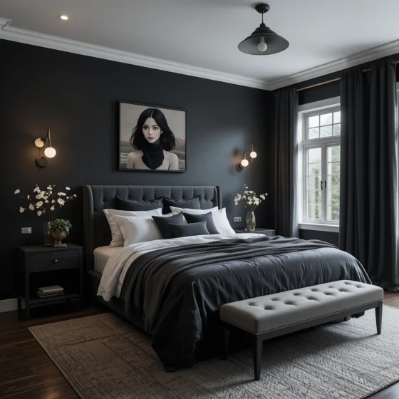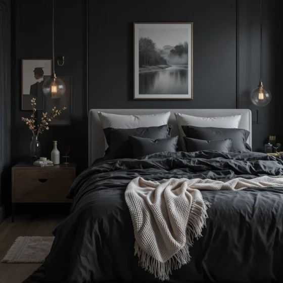 Opt for black or deep navy bedding to create a sleek and restful aesthetic. Soft fabrics like cotton or linen prevent it from feeling too heavy.