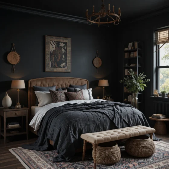 Mix dark boho textiles, patterned rugs, and woven baskets for a cozy eclectic vibe. It keeps the room grounded yet artistic Dark & Dreamy Bedroom.