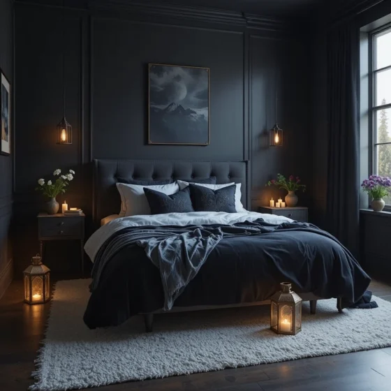 For a romantic glow, scatter candles and lanterns around your bedroom. The flickering light adds warmth and turns your dark decor into something magical.