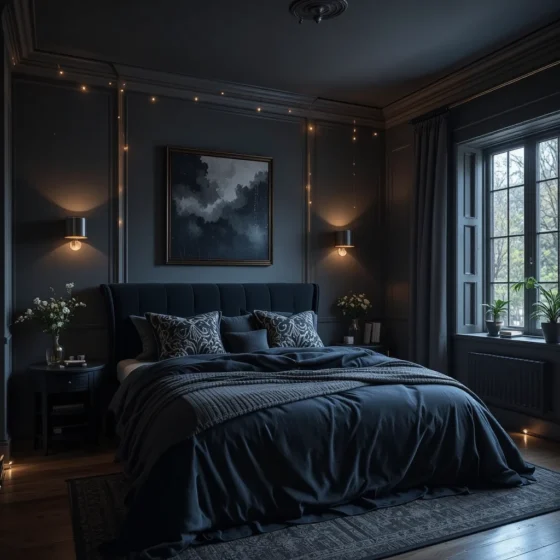 Use velvet bedding or curtains to give your bedroom a soft, dreamy vibe. The rich texture absorbs light beautifully and feels indulgent against dark walls Dark & Dreamy Bedroom.