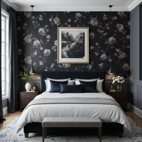 A moody floral wallpaper adds pattern and romance. Choose dark blooms with subtle metallic hints for a sophisticated touch.