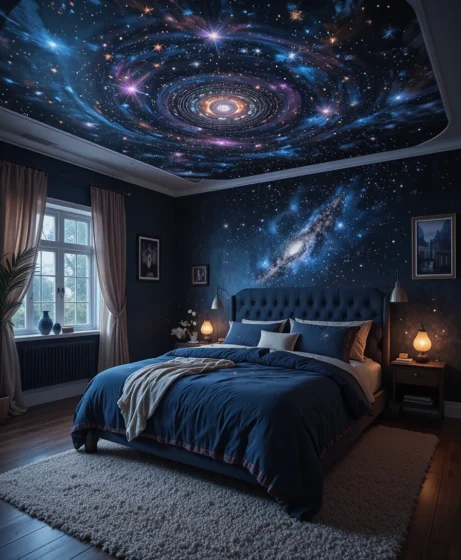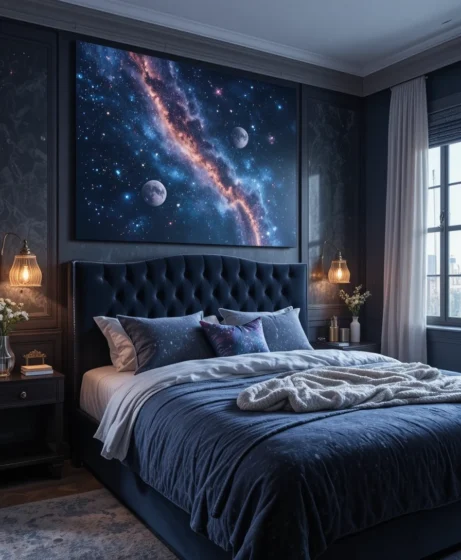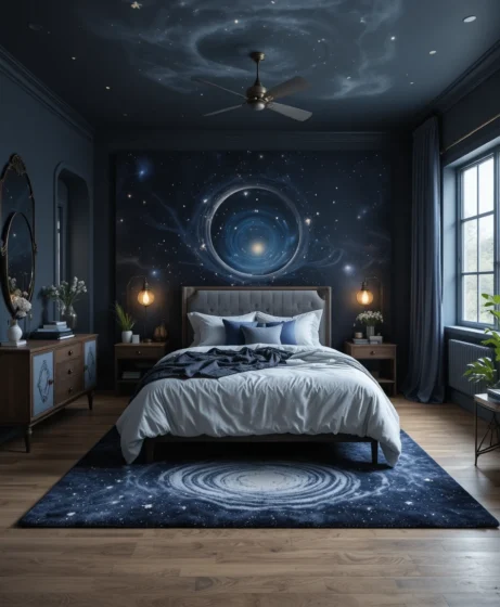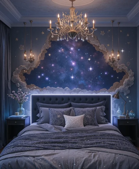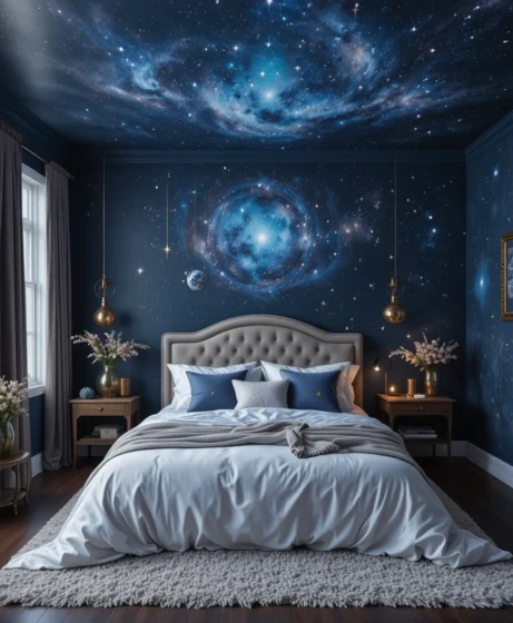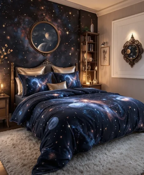 The combination of deep colors, cosmic elements, and glowing accents can turn any room into a personal galaxy.