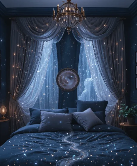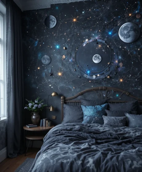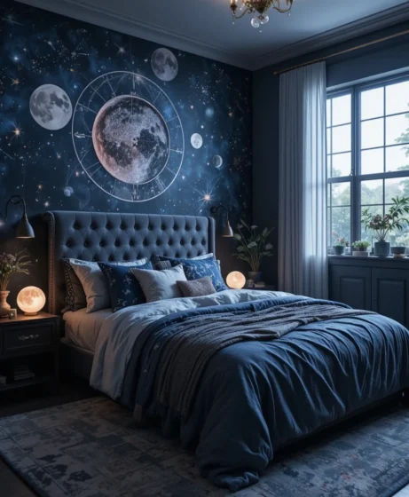 A midnight blue wall instantly creates a dramatic backdrop that resembles a clear night sky. This rich tone helps other celestial elements stand out beautifully. Pair it with metallic accessories to bring a striking cosmic contrast Dark Celestial Bedroom.