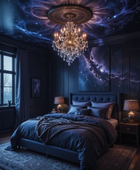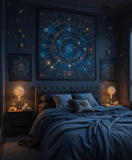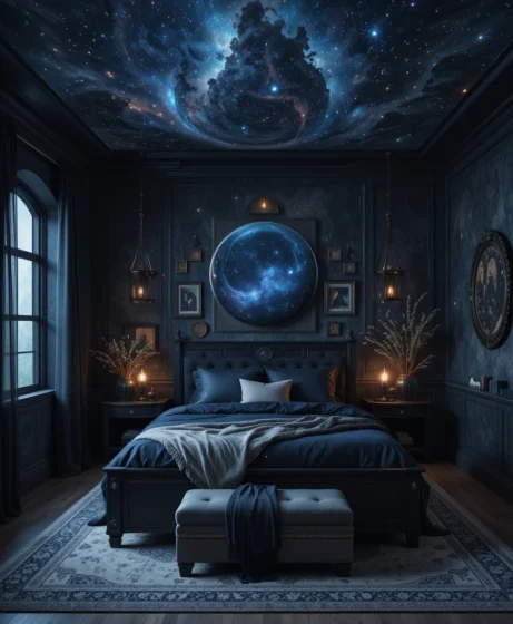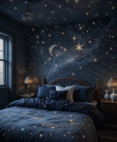 Creating a dark celestial bedroom is all about blending rich colors, glowing accents, and cosmic details to build a peaceful, dreamy atmosphere.