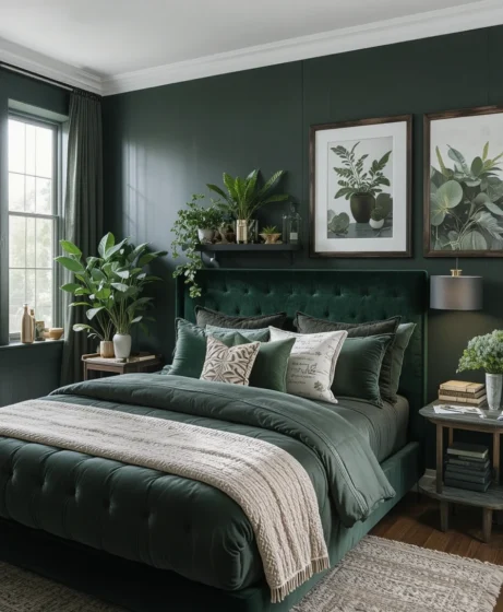 Embrace nature indoors by decorating with botanical prints and green plants. This idea enhances the natural beauty of dark green tones and adds a refreshing organic touch to your bedroom.