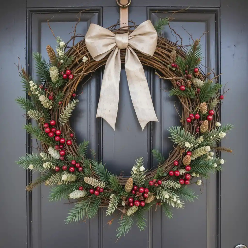 A natural grapevine base decorated with berries, pine, and ribbon creates an earthy, rustic look. Its simple style fits both modern and farmhouse homes. DIY Christmas Wreaths