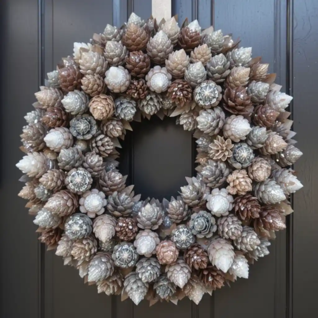 Collect pinecones, paint them with frosted tips or metallic accents, and glue them onto a circular base. This rustic wreath works beautifully indoors or outdoors.