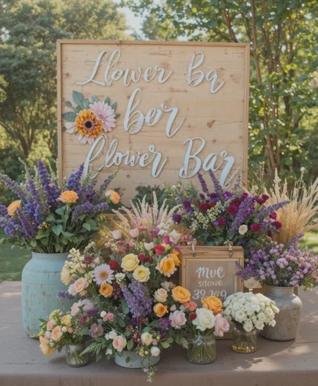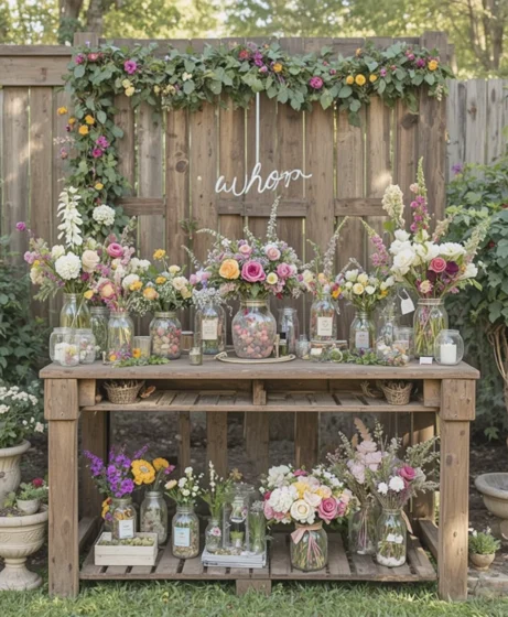 Use a wooden table or repurposed pallet as the base. Add mason jars filled with fresh blooms and greenery. This DIY Flower Bar style feels warm, welcoming, and perfect for backyard parties or country-themed events.