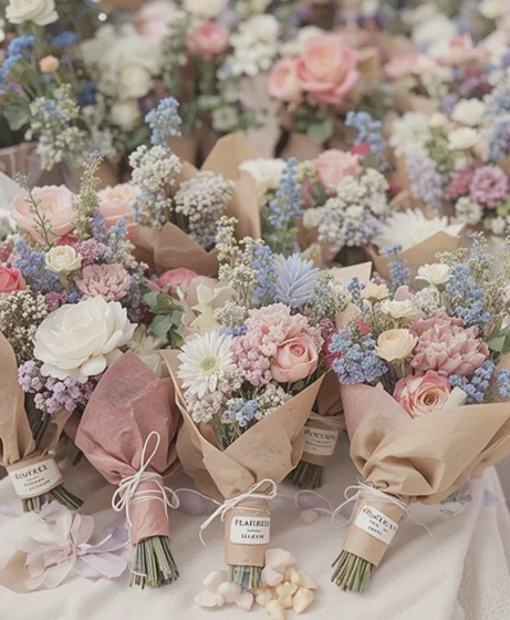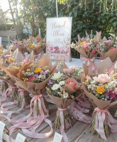 Let guests create their own mini bouquets as wedding favors. Provide wrapping paper and ribbon. This interactive idea becomes both entertainment and a takeaway gift.