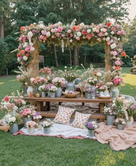 Combine your flower station with picnic tables and blankets. Keep flowers in galvanized buckets for a relaxed vibe. It’s perfect for summer gatherings.