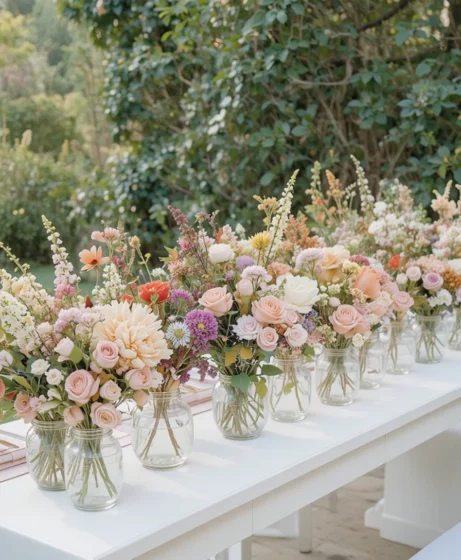 Choose one color palette such as blush pink and white or yellow and green. Keeping colors coordinated creates a cohesive and polished look. It also makes bouquet building easier for guests.