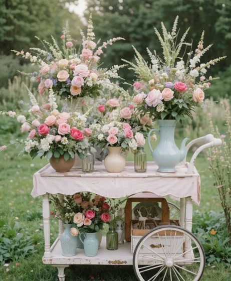 Use a decorative rolling cart or repurposed bar cart. Arrange flowers in vintage pitchers and jars. This charming design adds personality to your event décor.