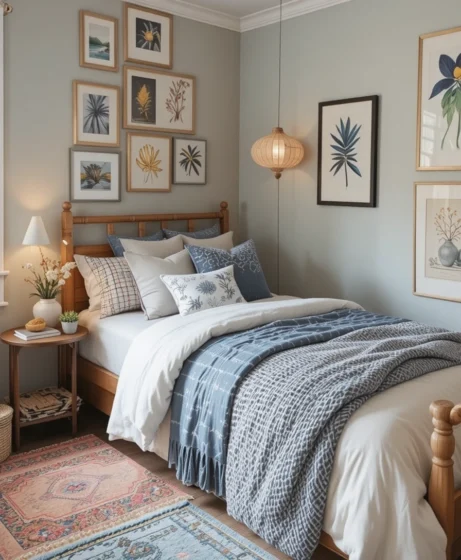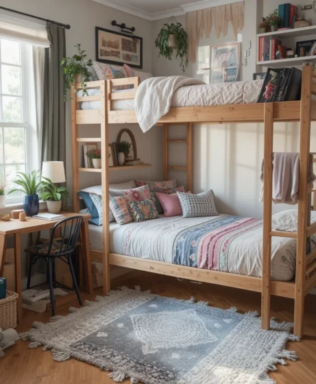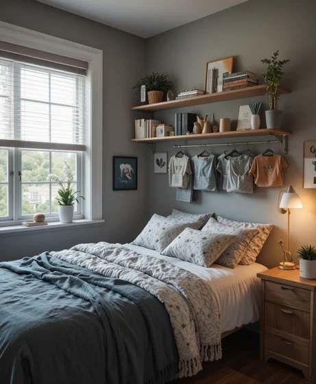 Choose bold bedding that instantly defines the room’s vibe. From modern stripes to soft pastels, bedding sets the tone and adds personality. Pick durable fabrics and textures that feel soft after long study hours. Layer with throws and accent pillows for a fuller look Dorm Room Decor.