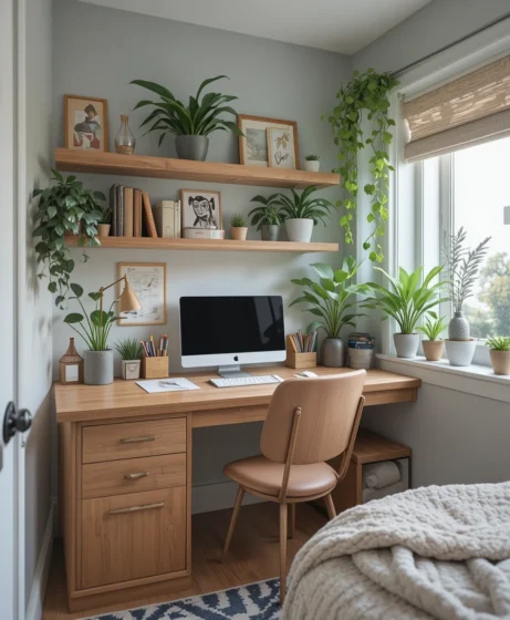Your desk should feel calming and motivating. Add a minimal lamp, pen holders, mini plants, or aesthetic desk pads. Choose colors that keep you focused—like soft greens or terracotta shades. A tidy desk supports better study habits.