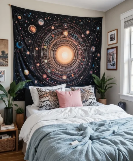 Tapestries create quick visual impact without heavy décor. Choose boho, cosmic, minimal, or geometric prints. Hang with adhesive hooks to stay dorm-safe. They fill blank walls and make the dorm feel more expressive.