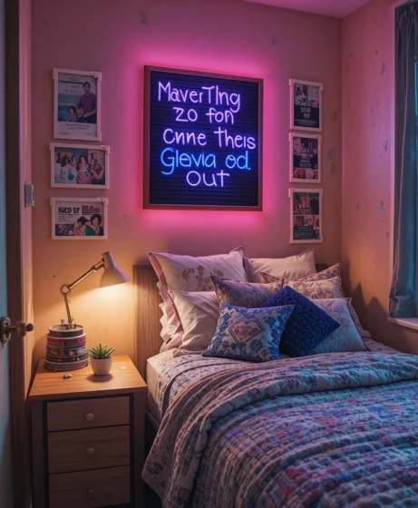 Letter boards or neon-style signs add personality without clutter. Display quotes, names, or weekly reminders. They work well above the desk or entry area. Soft LED versions add a warm glow at night Dorm Room Decor.