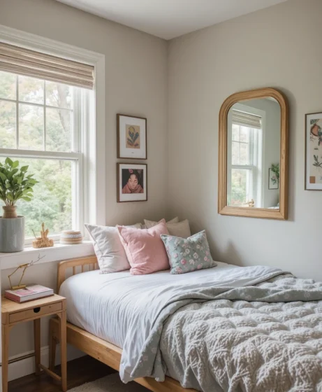 Mirrors instantly open up small rooms by reflecting light. Choose frameless styles or warm wooden frames. Full-length versions are useful for getting ready before class. Place mirrors near windows for maximum brightness.