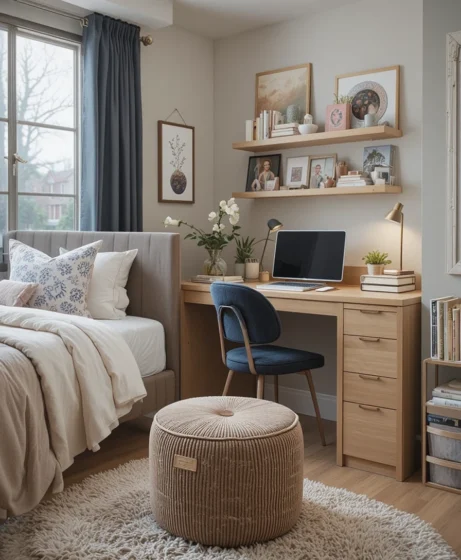 A compact chair or pouf adds extra seating for studying or relaxing. Choose soft fabrics like corduroy or boucle for texture. Keep the design minimal to avoid crowding the room. Place it near your bed or desk for functionality.