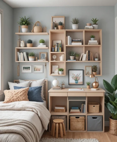 Floating shelves or simple cube shelving units offer both storage and display. Use them for books, plants, and decorative items. Choose cohesive colors for a neat aesthetic. Add small bins to hide personal items for a clutter-free look.
