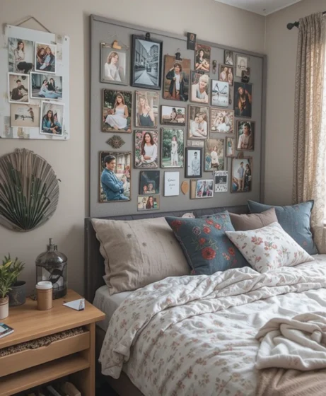 Create a memory wall using printed photos, postcards, or aesthetic prints. Arrange them in a grid or asymmetrical design. Use clips, adhesive strips, or mesh panels to stay dorm-friendly. It brings comfort and familiar energy to your space Dorm Room Decor.