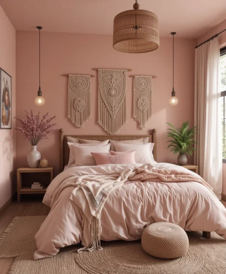 Use macramé wall hangings, woven rugs, and soft pink tones for a bohemian look. This style feels artistic, relaxed, and perfect for creative spaces.