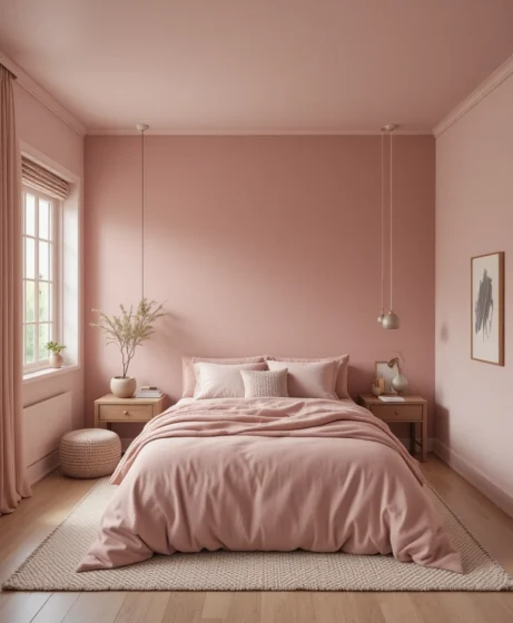 Matte finishes absorb light and reduce shine, making pink walls feel more soothing. Warm bedside lamps enhance the cozy atmosphere.