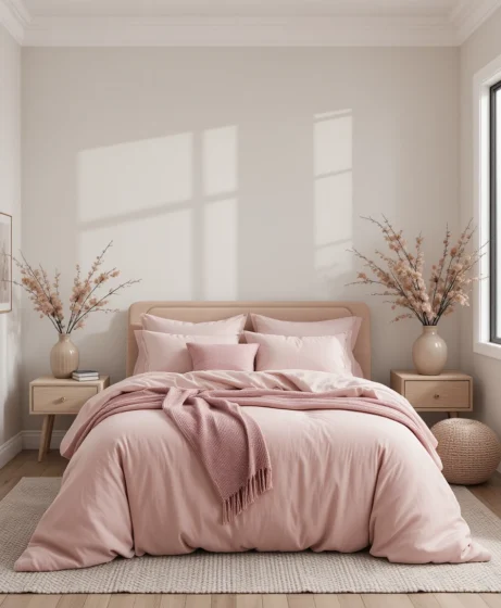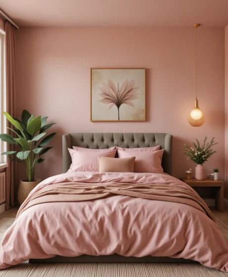 Combine earthy pink with plants, wood, and stone textures. This creates a bedroom that feels connected to nature and perfect for rest.