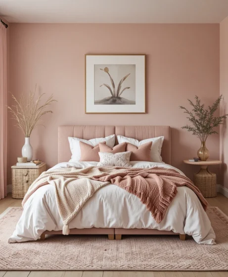 Rattan headboards, baskets, or lamps add natural texture. These organic materials enhance the earthy feel and make the pink tones feel more relaxed and balanced.