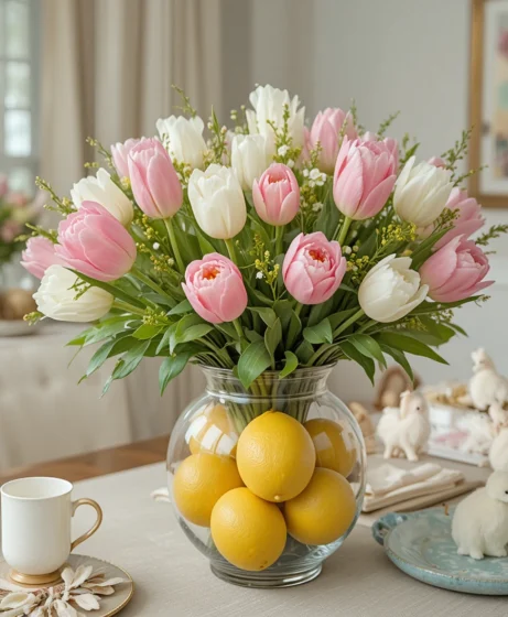 Place whole lemons inside a clear glass vase and arrange pink or white tulips above them. The citrus base adds a bright, sunny touch while tulips bring classic spring beauty to your Easter table.