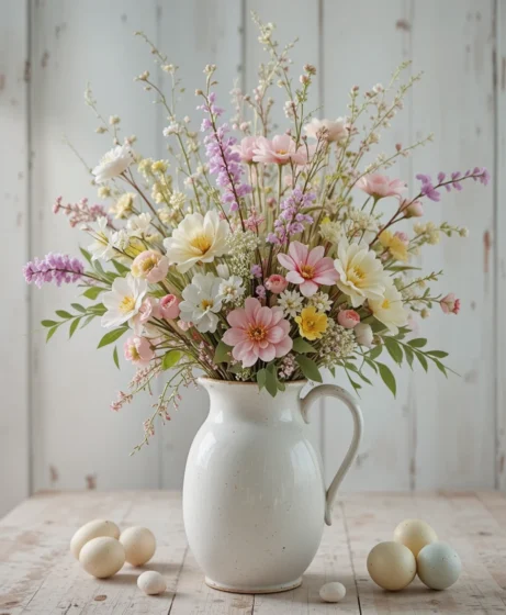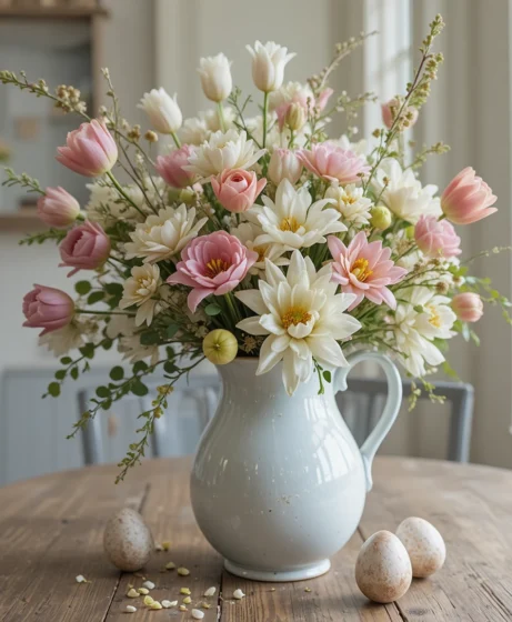 Use a ceramic pitcher as a vase for tulips, lilies, and greenery. This relaxed country look feels inviting and perfect for Easter gatherings.
