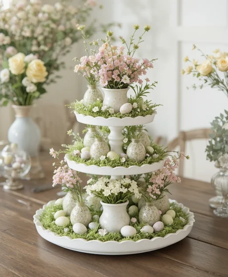 Decorate a tiered tray with mini flower vases, greenery, and small Easter eggs. This layered look adds height and interest to side tables.