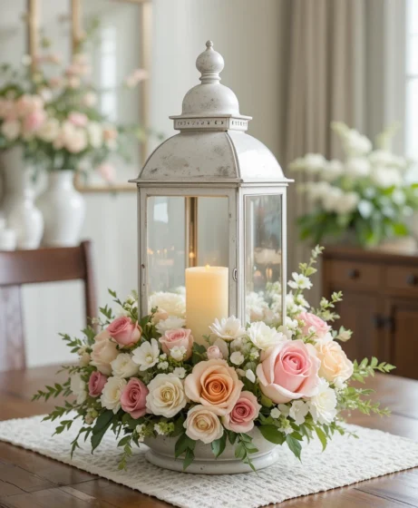 Surround a lantern base with flowers and greenery while placing a candle inside. This creates a cozy Easter ambiance, especially in the evening.
