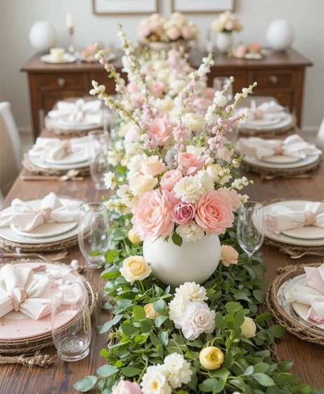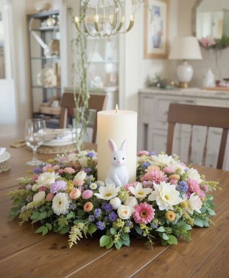 Lay a floral wreath flat on the table and place a candle or bunny figurine in the center. It frames the table beautifully without blocking conversation.