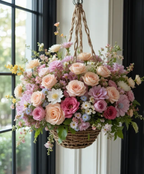 Hang a basket of spring flowers near a window or doorway to add color to vertical spaces.