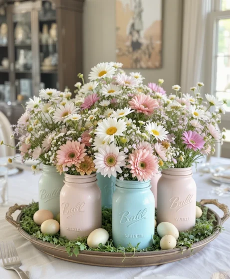 Paint mason jars in soft pastel shades and fill them with daisies, carnations, and baby’s breath. Group them on a tray to create a charming rustic Easter arrangement.