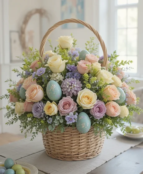 Line a woven Easter basket with floral foam and arrange roses, greenery, and decorative eggs. This festive piece works perfectly as a centerpiece or entryway display.