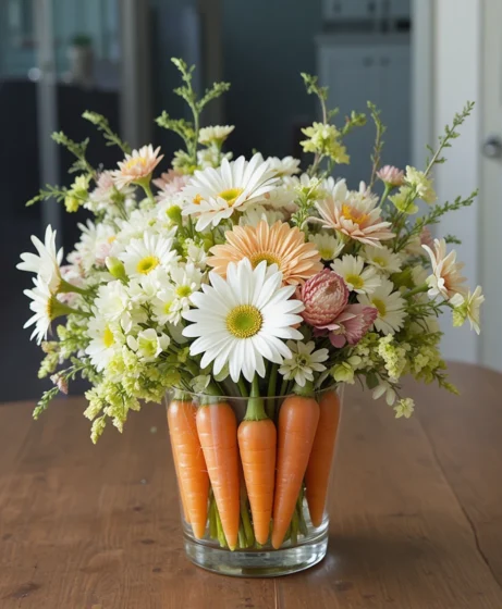 Stand whole carrots between the walls of a clear vase and place white daisies or orange gerberas in the center. This playful design ties beautifully into the Easter theme.