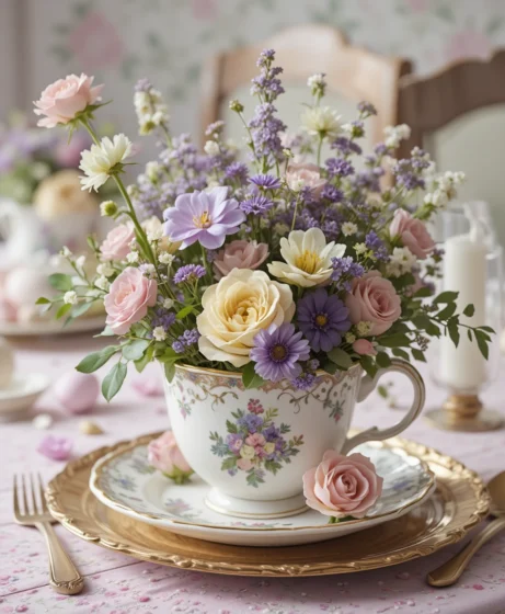Fill vintage teacups with tiny blooms like violets or baby roses. Place one at each table setting for an elegant and personal Easter touch.