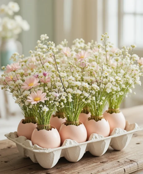 Use cleaned eggshells as mini vases for small flowers like baby’s breath. Display them in an egg carton for an adorable and creative Easter decoration.