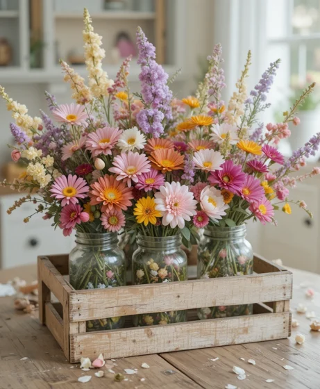 Arrange mason jars filled with colorful wildflowers inside a wooden crate. This setup adds rustic charm and bright spring color to your décor.