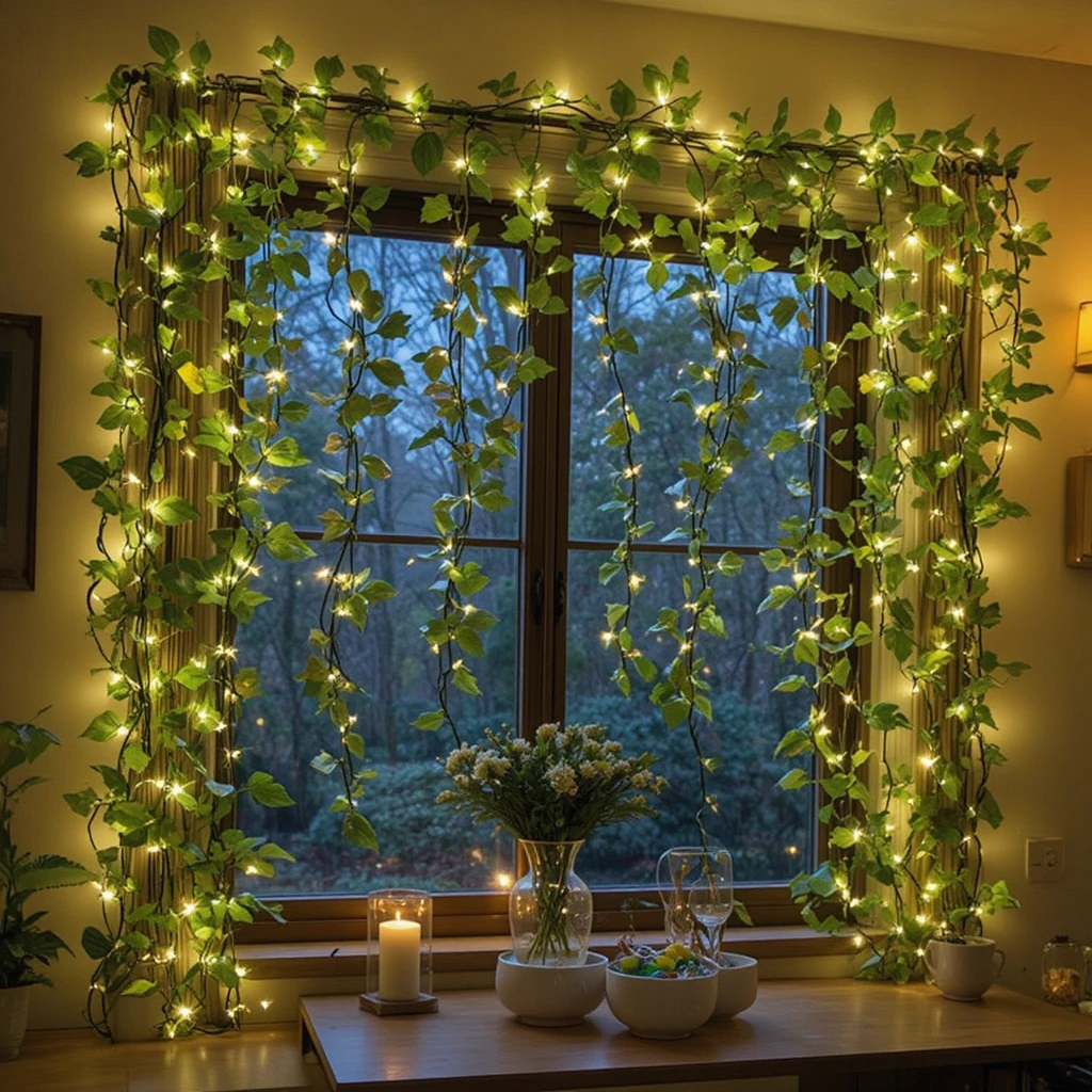 Brighten your kitchen by hanging leaf fairy light curtains across your window. The lights bring a cheerful natural glow, perfect for early mornings or cozy evenings.
