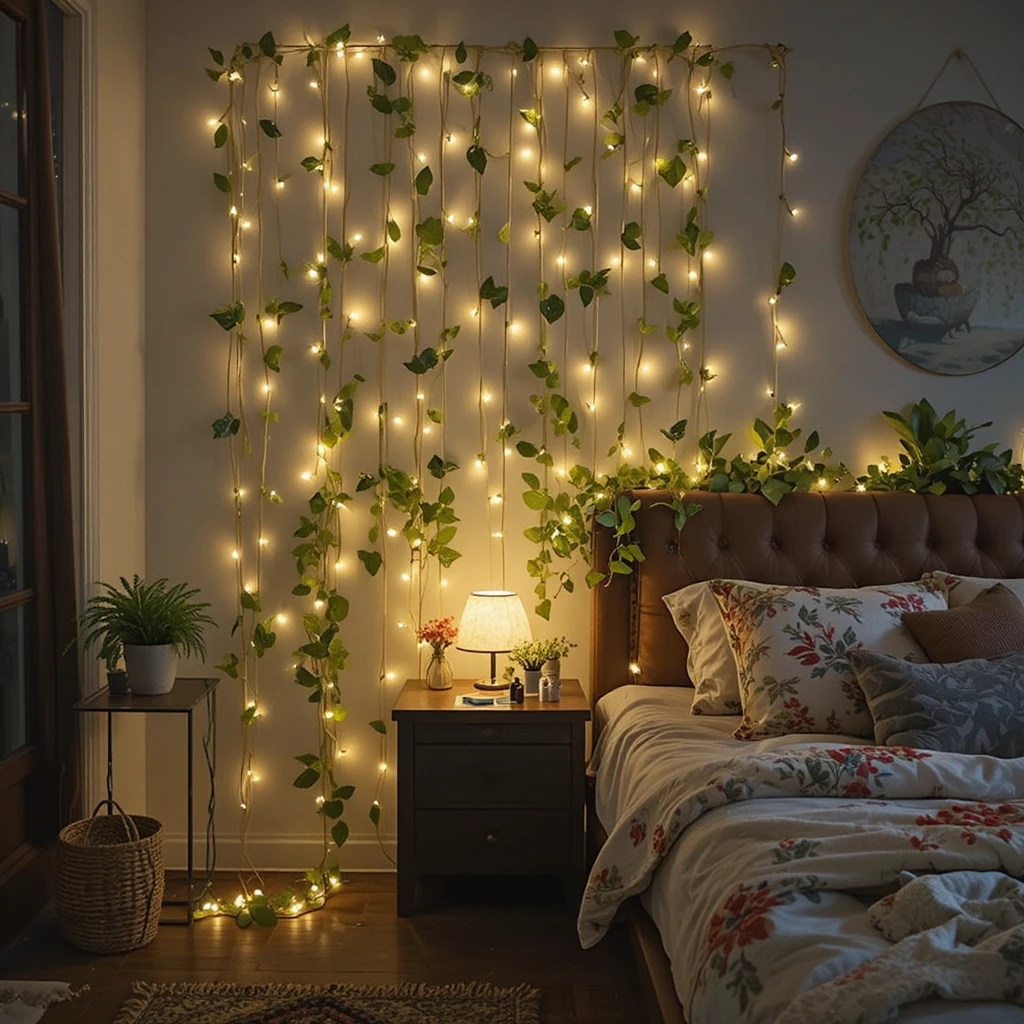 Hang fairy light leaf curtains behind your bed to design a calm, romantic atmosphere. The gentle light paired with greenery adds a soothing forest vibe perfect for relaxing nights.